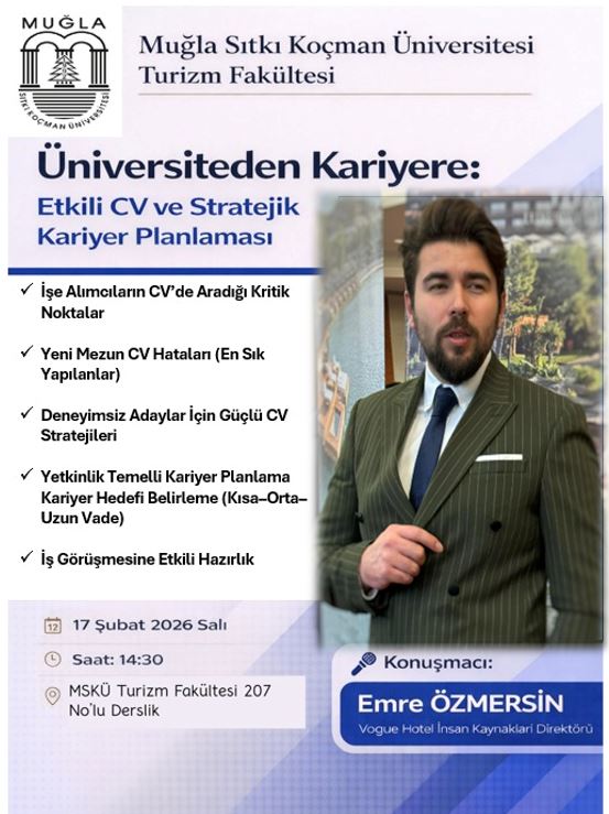 Üniversiteden Kariyere: Etkili CV ve Stratejik Kariyer Planlaması Etkinliği 20. Turizmde Okul-Sektör Organizayonumuz kapsamında, değerli tecrübelerini paylaşmak üzere Vogue Hotel İnsan Kaynakları Direktörü Emre ÖZMERSİN'i ağırlayacağız. Tüm öğrencilerimiz davetlidir. Son Güncelleme : 17.02.2026 10:10 Okunma Sayısı : 6